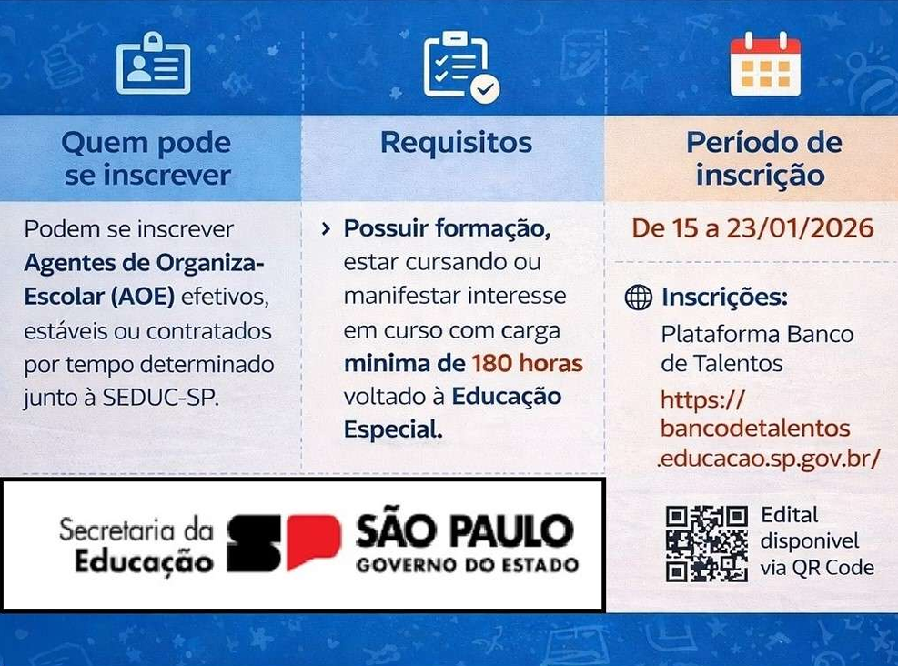 EDITAL – BANCO DE TALENTOS AGENTE DE ORGANIZAÇÃO ESCOLAR – AOE 21-01-2621 de janeiro de 2026 >>> EDITAL – BANCO DE TALENTOS AGENTE DE ORGANIZAÇÃO ESCOLAR – AOE LEIA TAMBÉM Edital de Vice Diretor – EE Bom Pastor II Edital de Vice Diretor – EE Maria Angélica Soave – 2026 Resultado – Edital Vice Diretor 01/2026 – EE Benedita de Oliveira Ale Edital – Professor Tutor Anos Iniciais